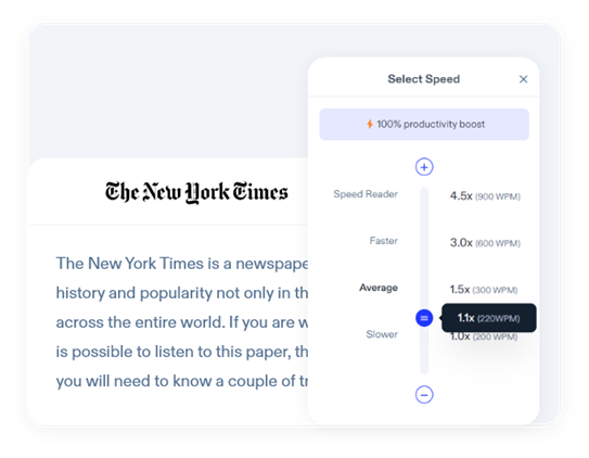 Listen up to 9x faster with Speechify’s ultra realistic text to speech software that lets you read faster than the average reading speed, without skipping out on the best AI voices.