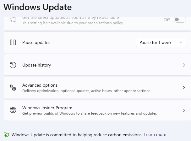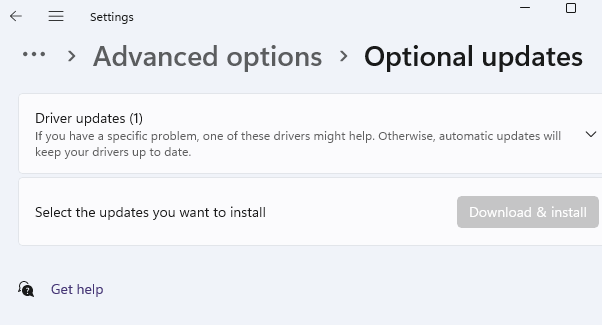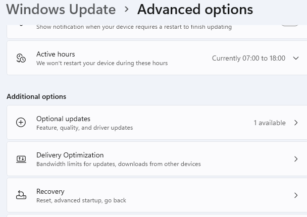 With both these sub menus, Windows updates, and Windows update advanced settings, it may be necessary to "scroll down" to find these options/sub-menus/Optional Updates.